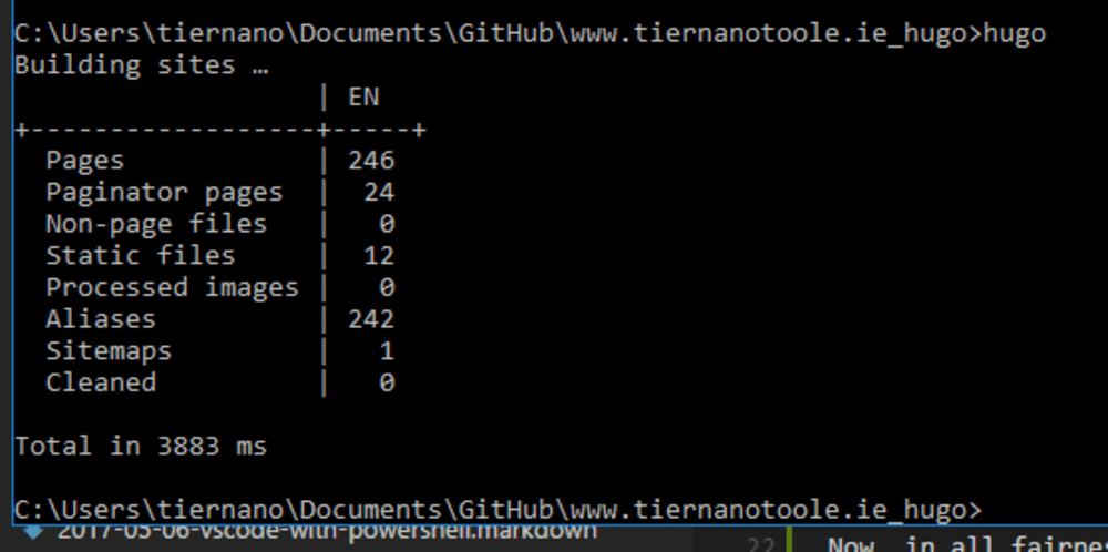 the other big advantage is that Hugo arrives in a single EXE (or other binary format for other platforms) and runs on Windows without any extra stuff to install… drop the EXE in your path, cd into the folder, and hugo serve and you have a web server running with your files… if you want to deploy them, run hugo and it builds the project and sticks it in your public folder. Do what you want with it from there! Happy day!